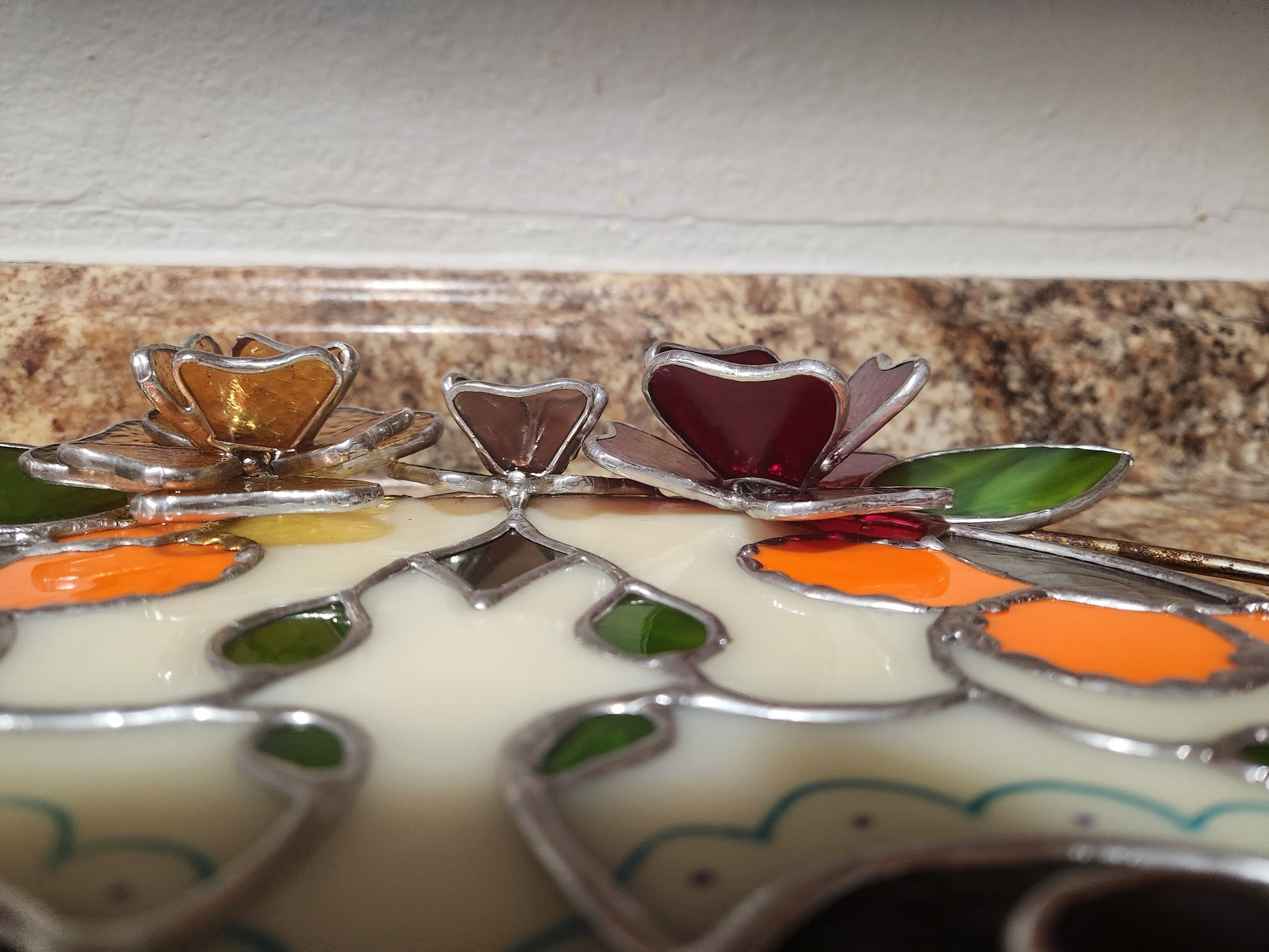 "Abuela" is an accumulation of all the techniques I use in my stained glass products. 3D, etching and glass paint. She measures about 18 inches 14 inches, plus a chain for hanging.