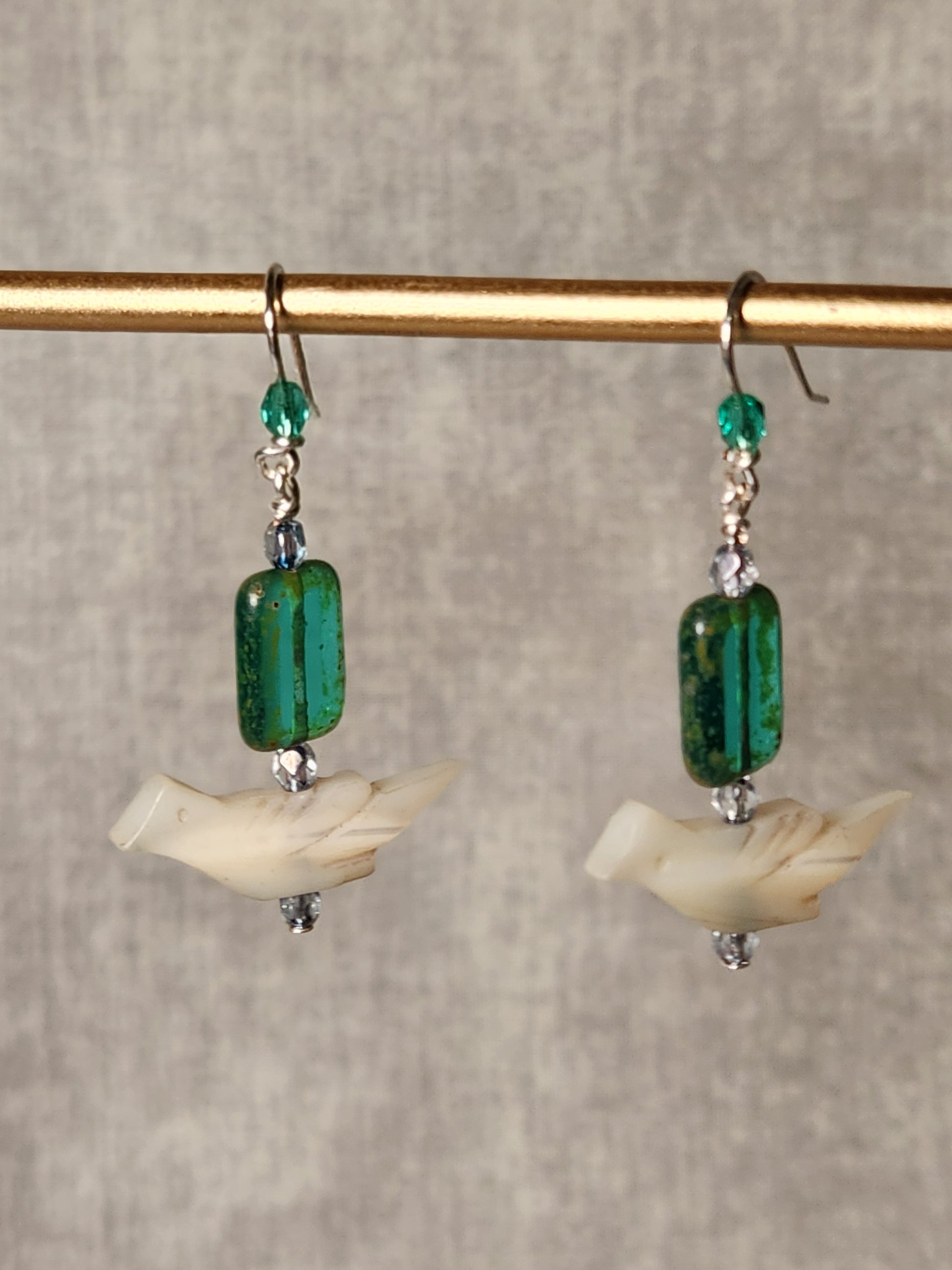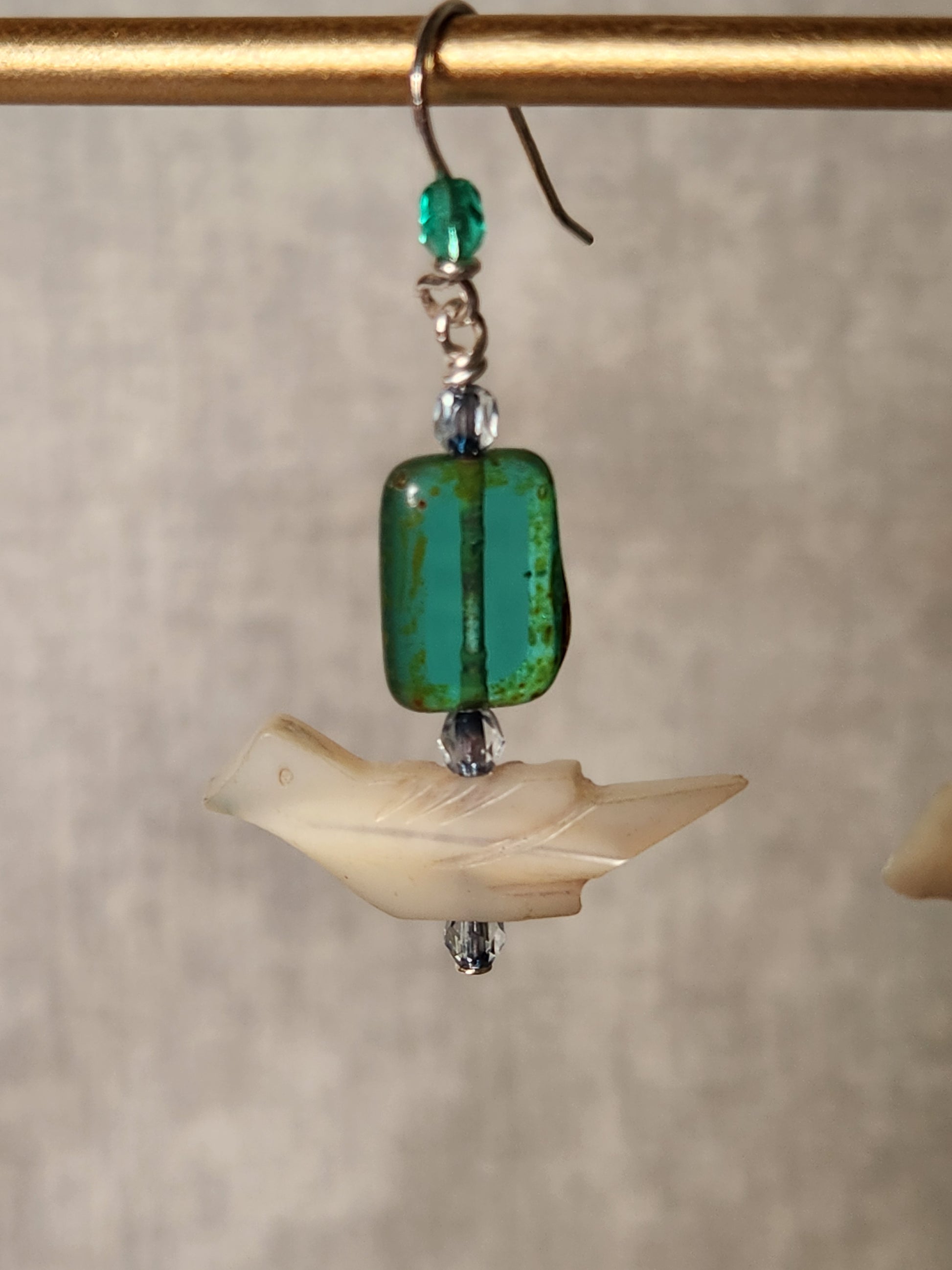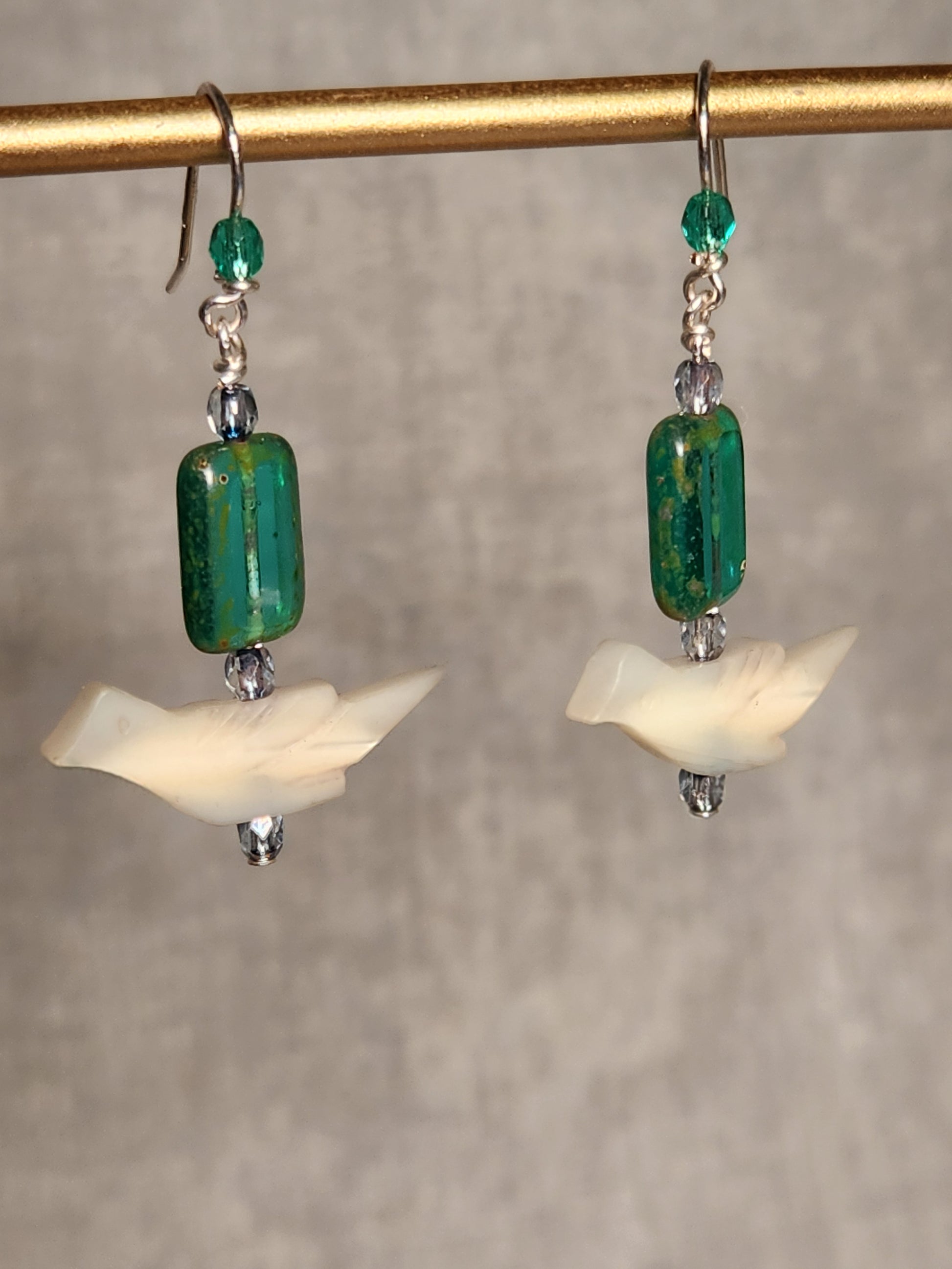 Take flight with these whimsical earrings inspired by nature's freedom. Mother of Pearl birds soar alongside soft sea glass beads, creating an ethereal design that feels like a gentle breeze. Suspended from sterling silver ear wires and measuring nearly 2 inches long, they're your ticket to sky-high style.