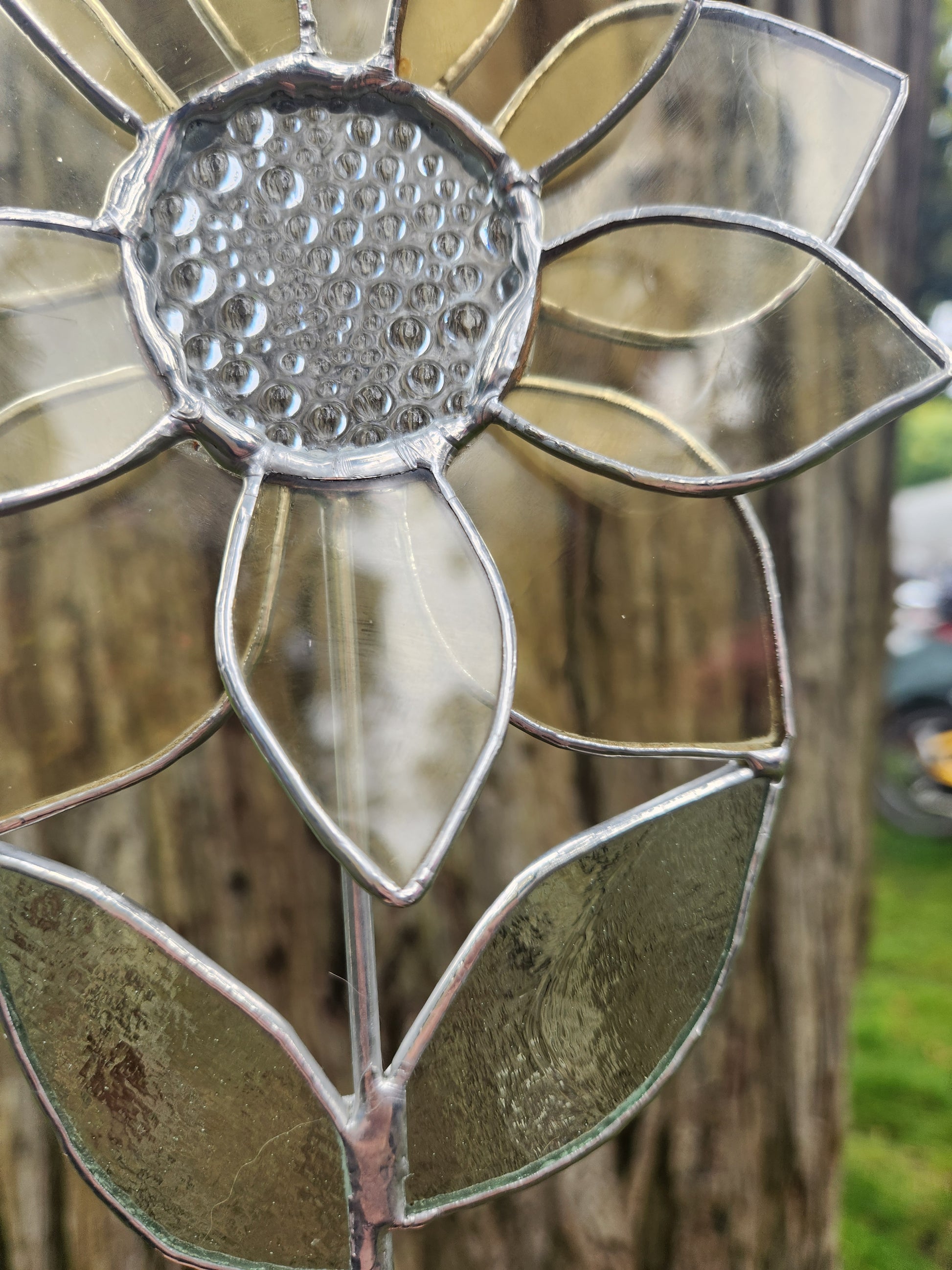 Soft Yellow Stained Glass Sunflower Plant Stake with Textured Clear Center