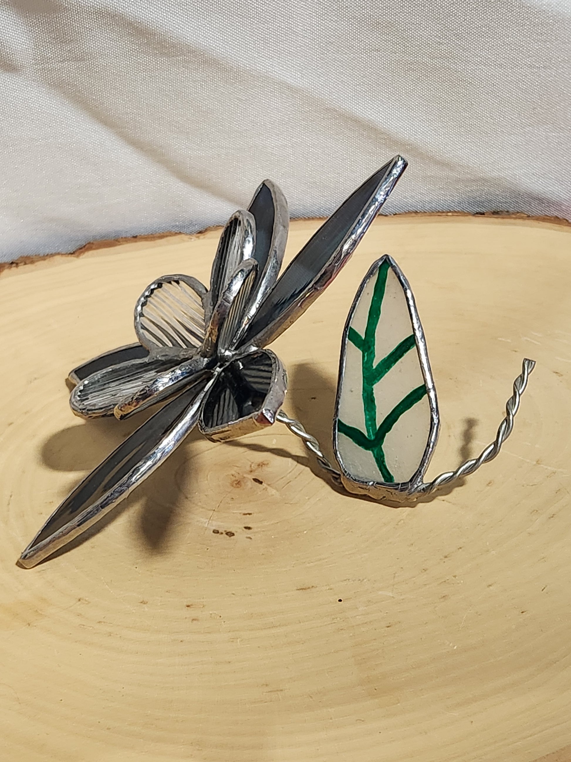 Experience the refreshing beauty of nature in your home with our stunning Cobalt & Clear Reeded Stained Glass Table Flower with a white textured glass leaf with paint accent! This gorgeous piece measures approximately 3.5 x 4 inches. Enhance the ambiance of your living space with ease, as this piece effortlessly complements any home decor.