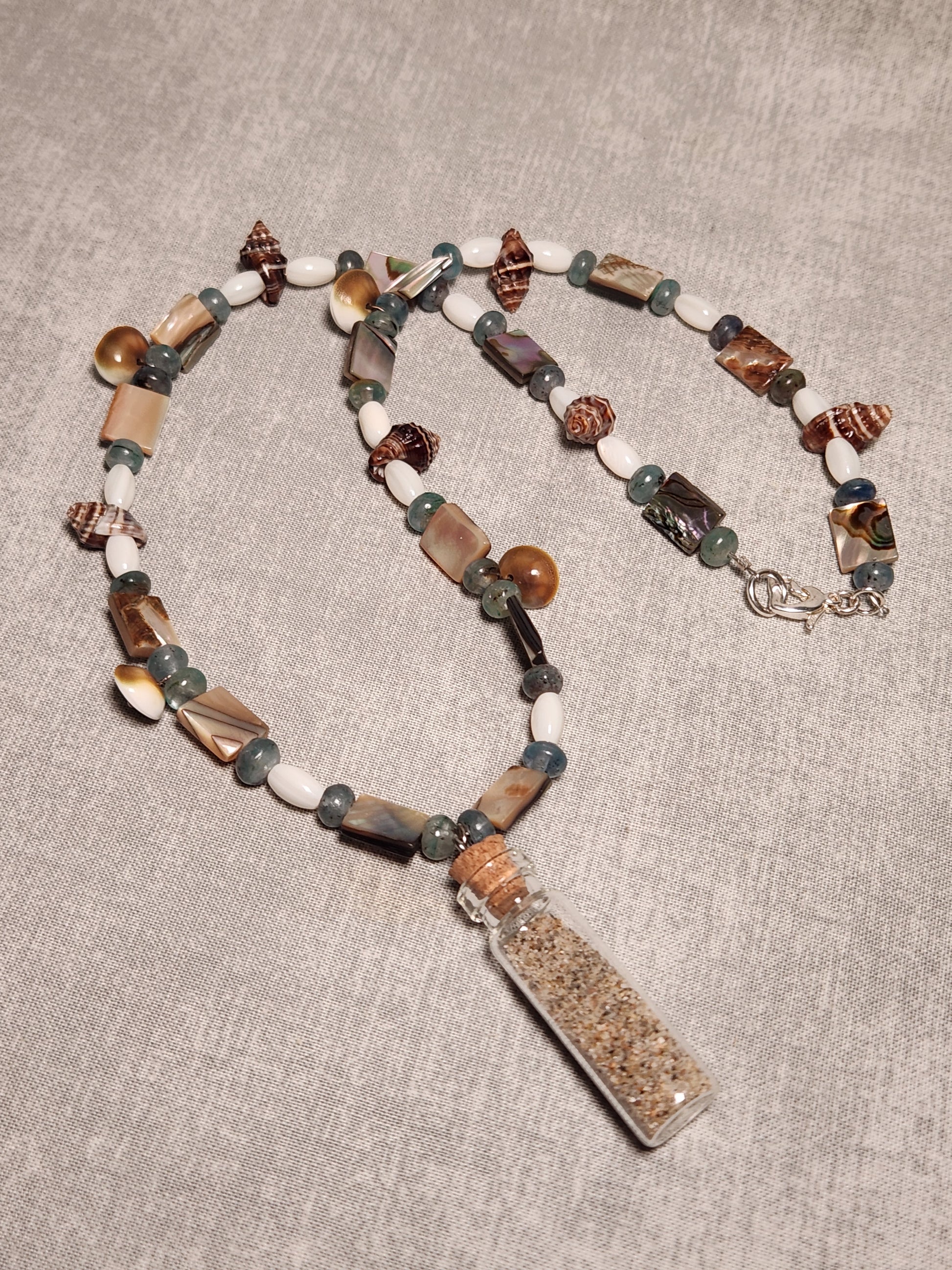 A celebration of coastal living, this necklace brings the beach to your neck with Mother of Pearl, Abalone, Blue Fluorite, and charming mini shells all working together in perfect harmony. The standout feature? A pendant vial filled with actual sand from a California beach—your personal reminder of ocean breezes and sandy toes. Sterling silver heart clasp and findings add sweetness to the nautical aesthetic. Measuring 19 inches, it's designed to be your new favorite accessory for sunset strolls, seaside adventures, and those moments when you're daydreaming about waves. Layer it, wear it solo, or pair it with a sunhat for the ultimate coastal-chic look.
