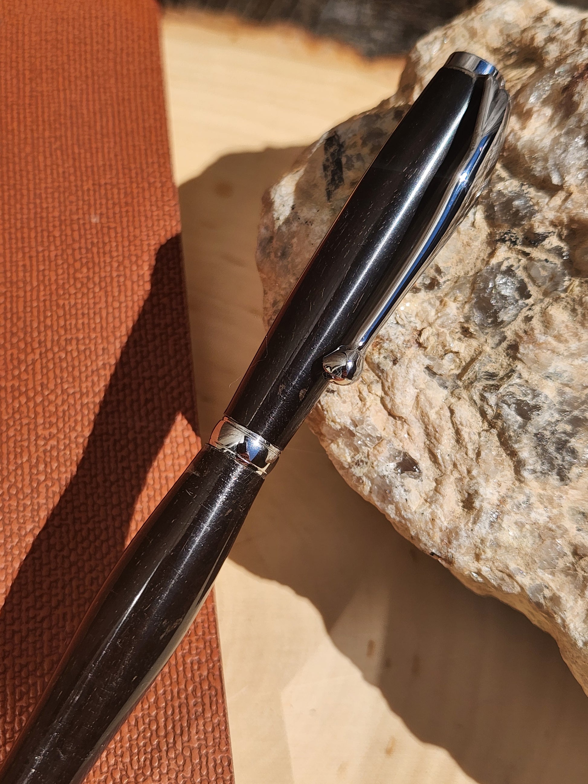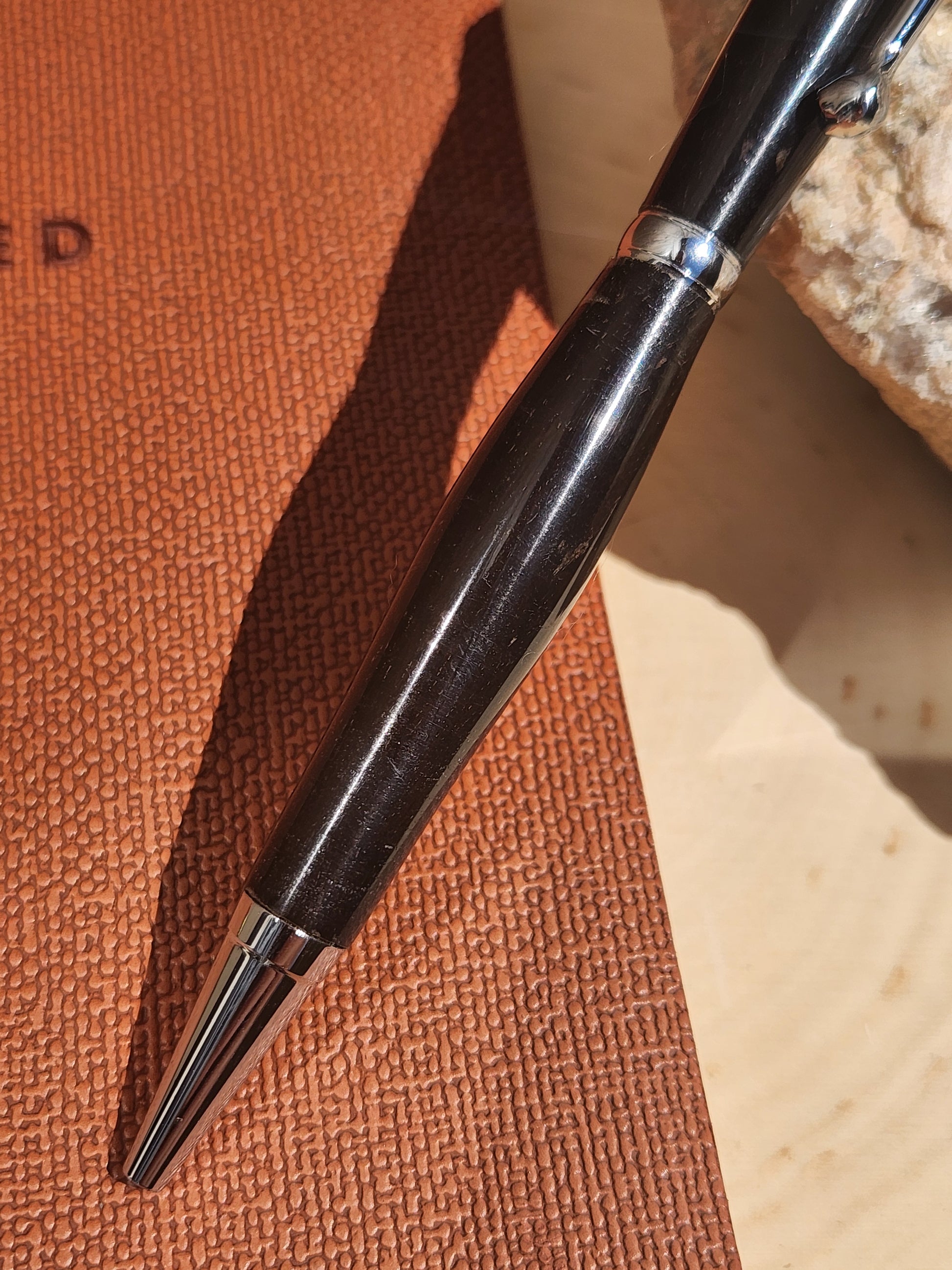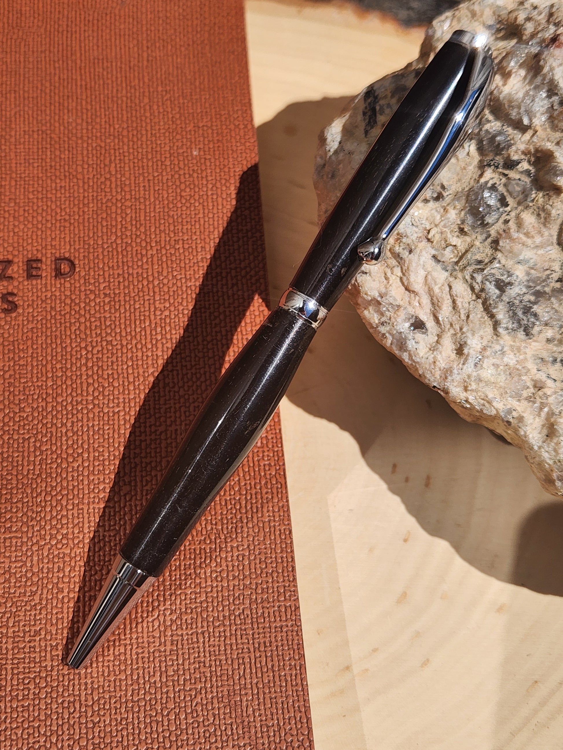If you’re hunting for the perfect Forever Pen, your search ends here with our Gaboon Ebony Wood Slim Line Twist Pen. Measuring just over 5 inches, with its glossy finish. It’s a fantastic gift for grads, bosses, or anyone celebrating a new job. Proudly handmade in the USA! Comes with a fabric sleeve for protection.