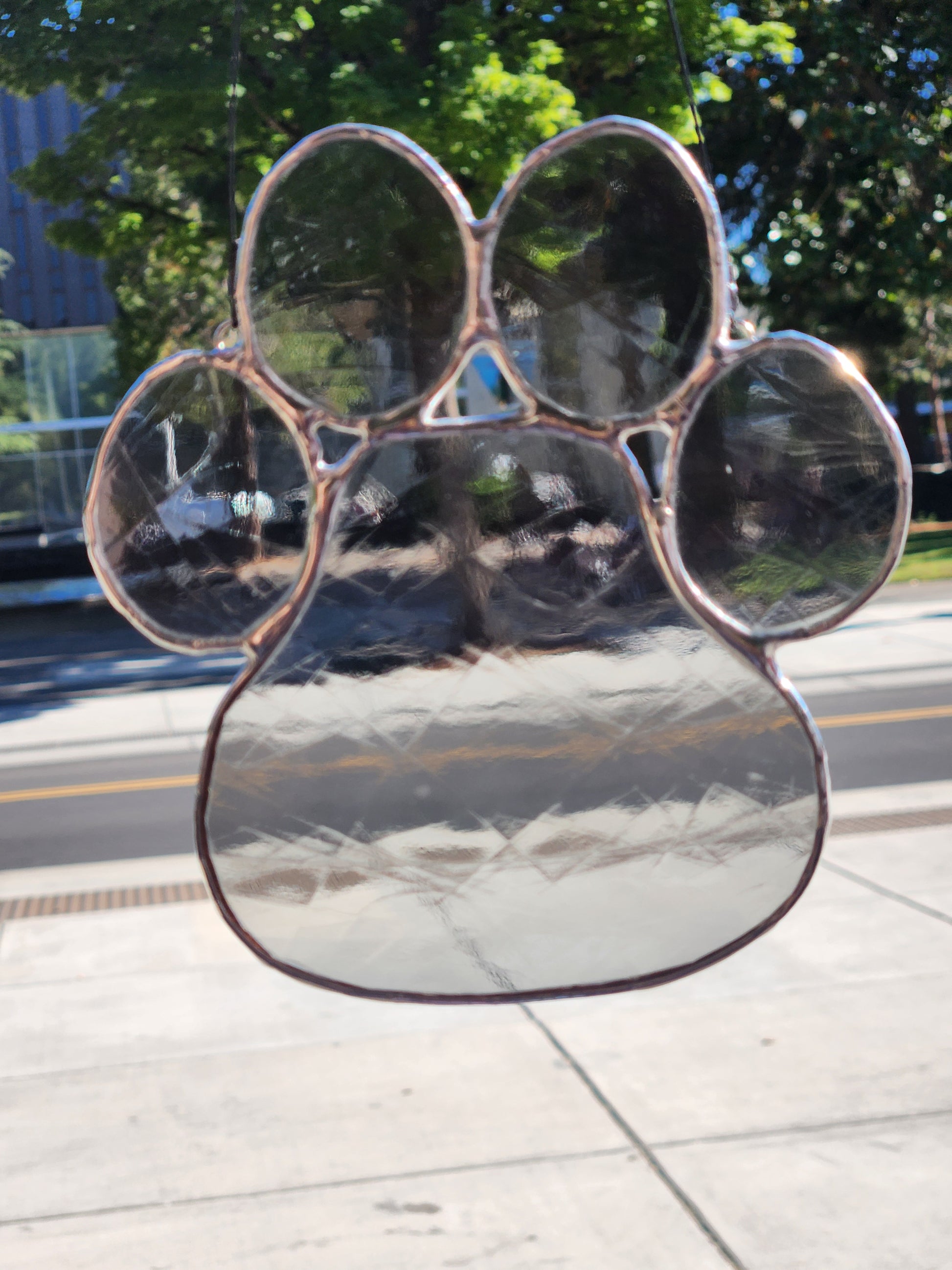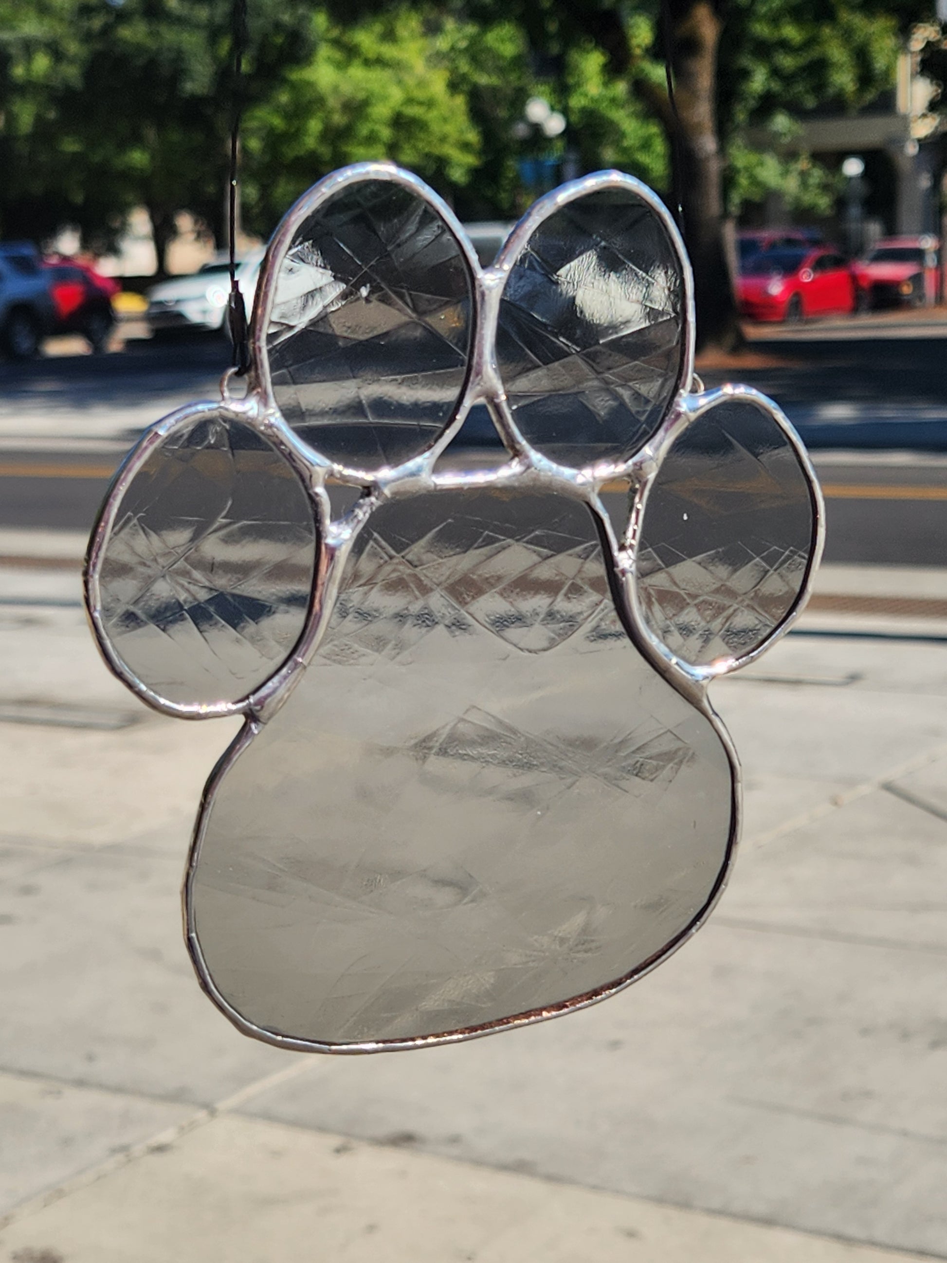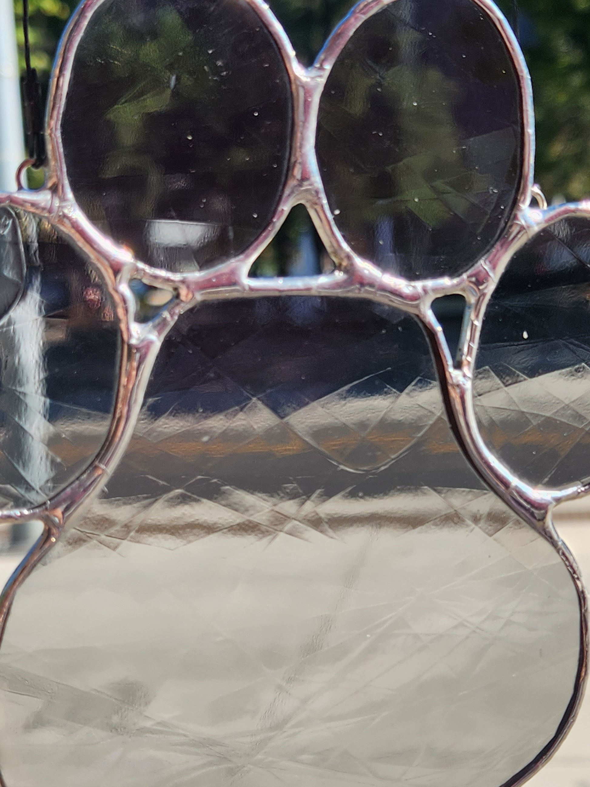 Get your paws on this Gray Translucent Swirl Stained Glass Paw Print with hanger! Measuring a paw-some 5.5in H x 6in W, this unique piece will add some quirky charm to any space.