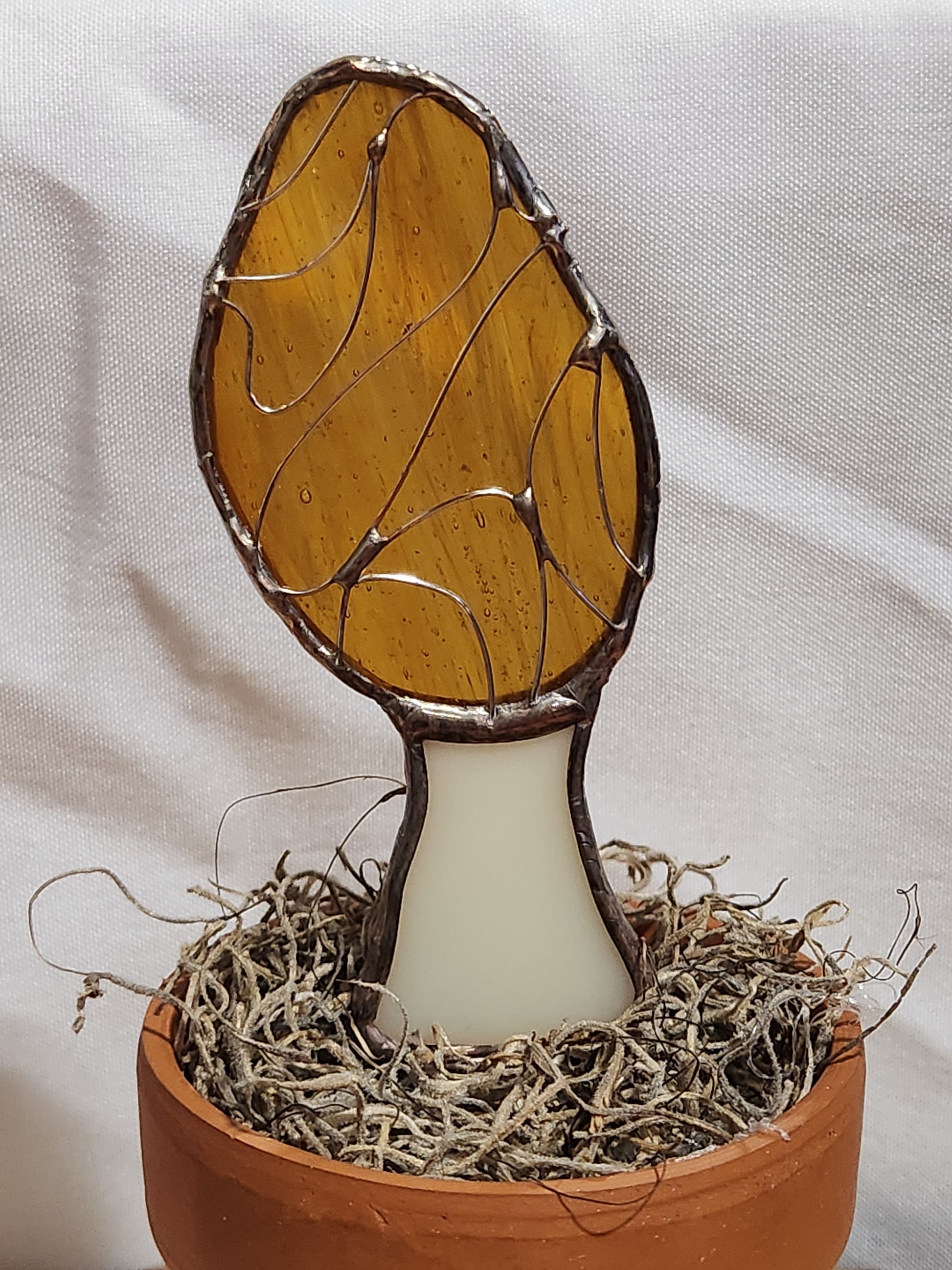 Life-Sized Morel Mushroom Stained Glass Plant Stake - Cooper Patina