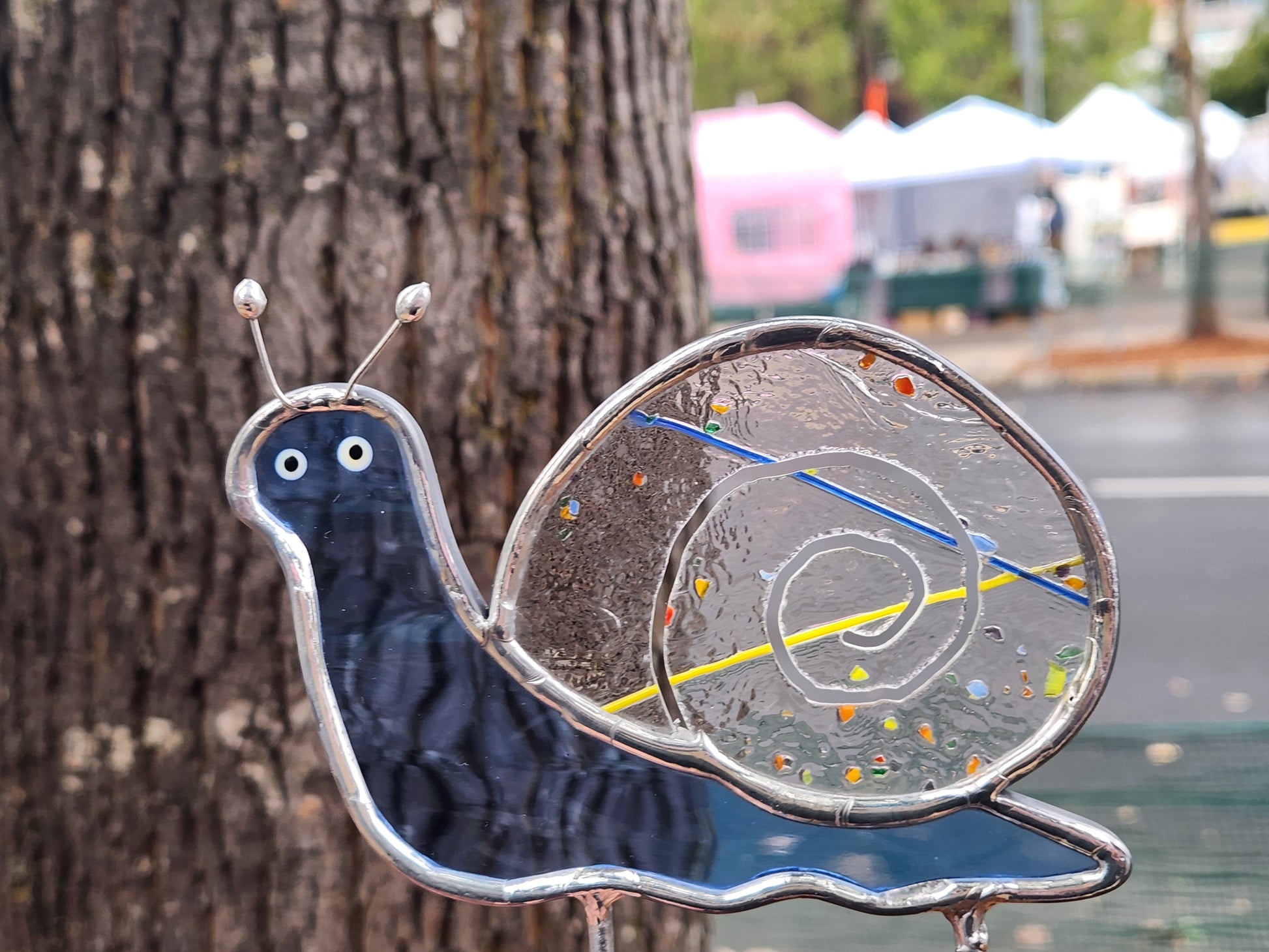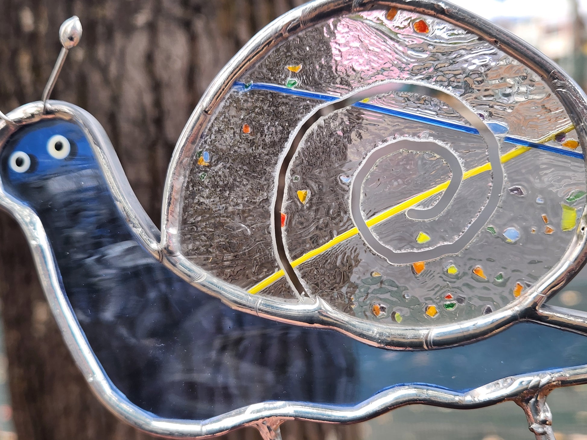 Light Blue Waterglass & Rainbow Confetti Snail Stained Glass Plant Stake