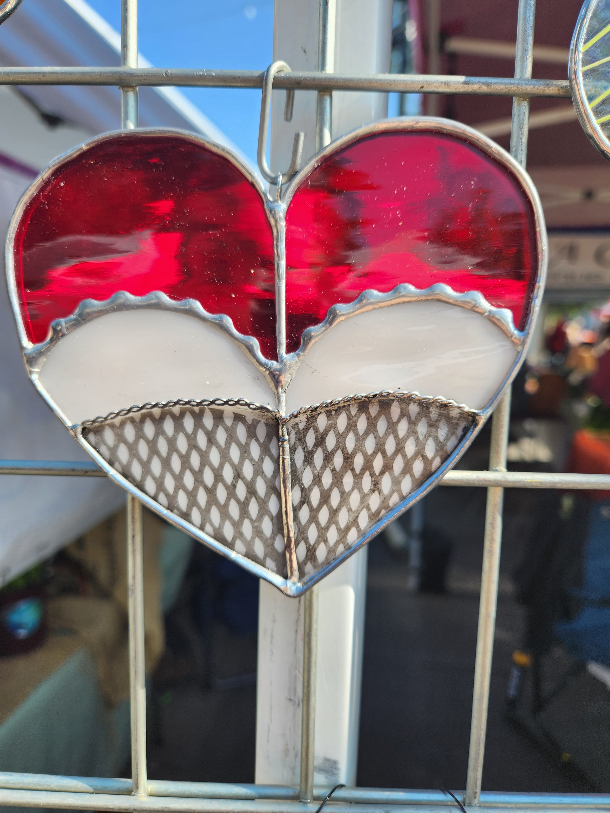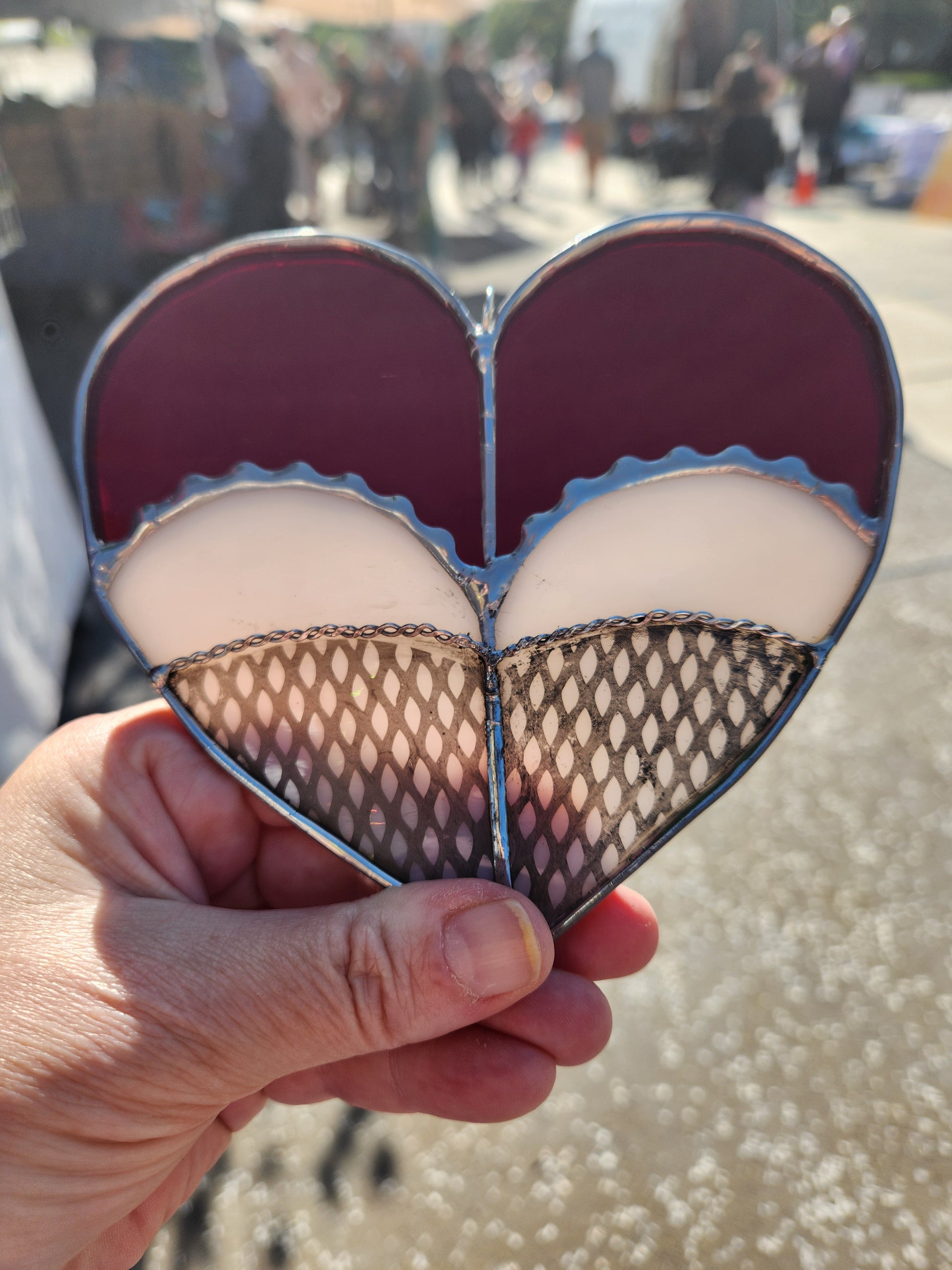 Get ready to grin with a cute, heart-shaped booty! Made of red mirror and flesh-colored stained glass, this piece is approximately 6 inches by 6 inches and comes with a loop for hanging wherever your heart desires. And as an added touch, check out the etched fishnets with black etching for some fun detail. (Your heart will thank you!)
