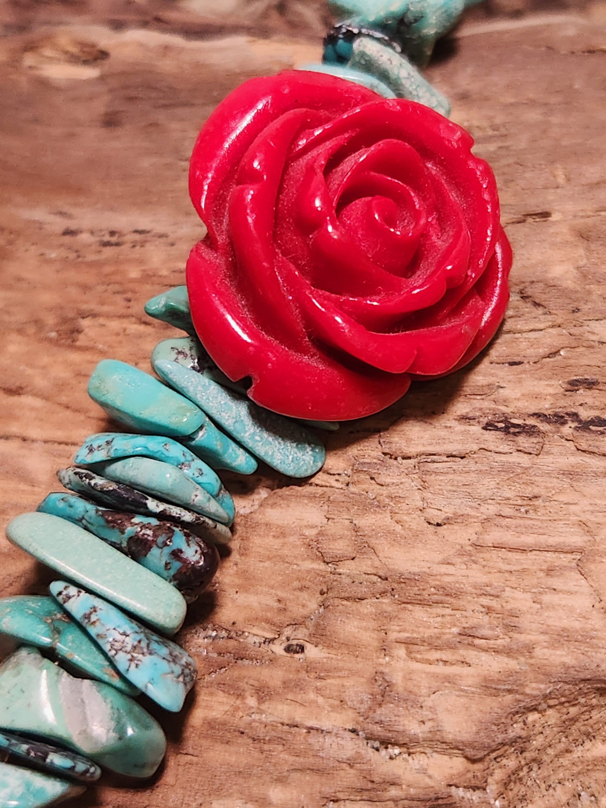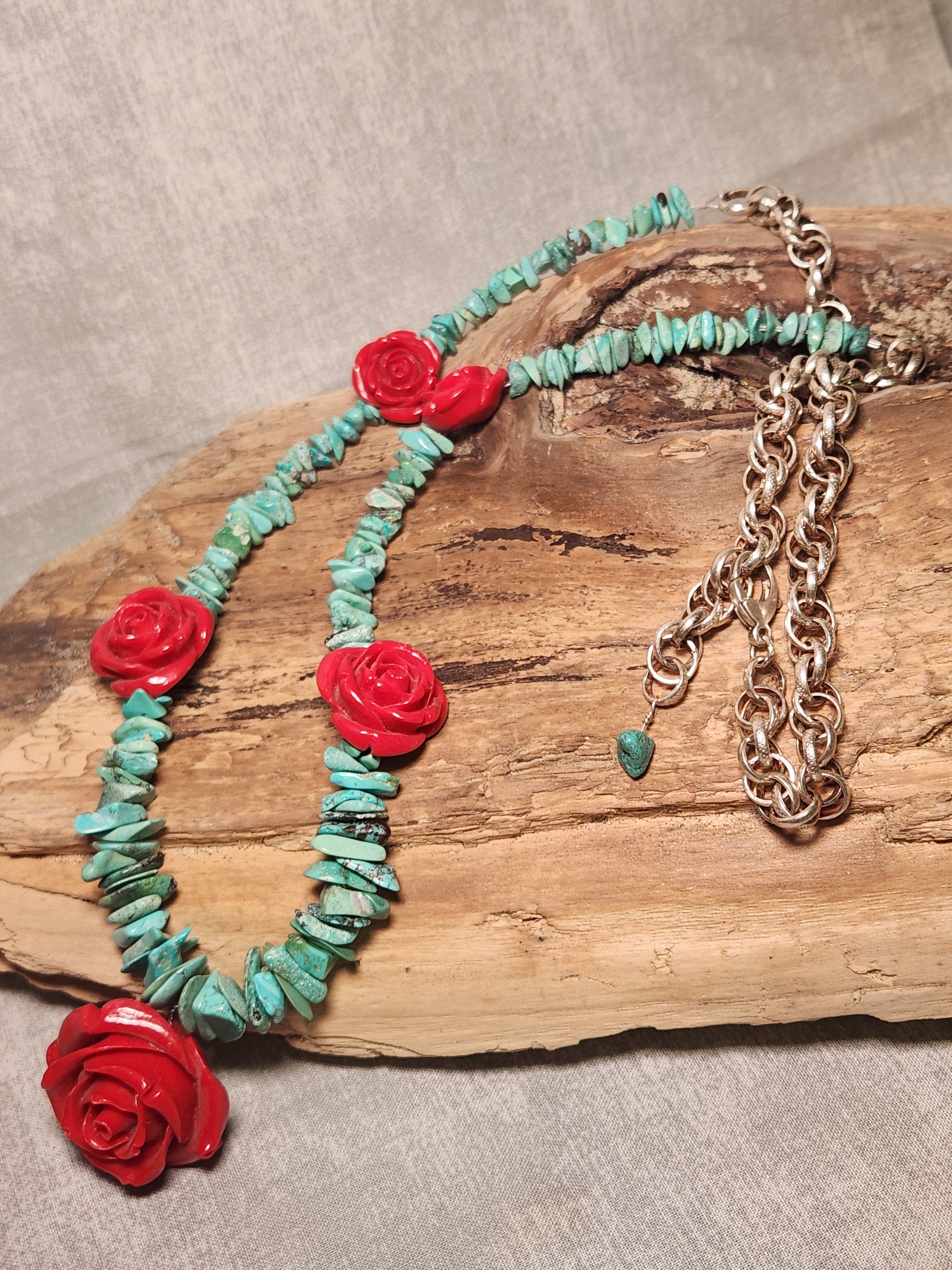 Dive into color with this playful necklace that captures the magic of Gentle Water and Coral Kissed by the Sun. Turquoise and hand-carved coral flowers dance along a substantial sterling silver chain, each bloom graduating in size for visual interest that draws the eye. The 18-inch flower strand is connected to 6 inches of chain on both sides, giving you total control over how you wear it—snug at the collarbone or relaxed and layered lower. Crafted for those who love a little personality in their accessories, this piece works solo as a bold statement or pairs beautifully with delicate chains for a curated look. Adjustable, artisan-made, and endlessly fun.